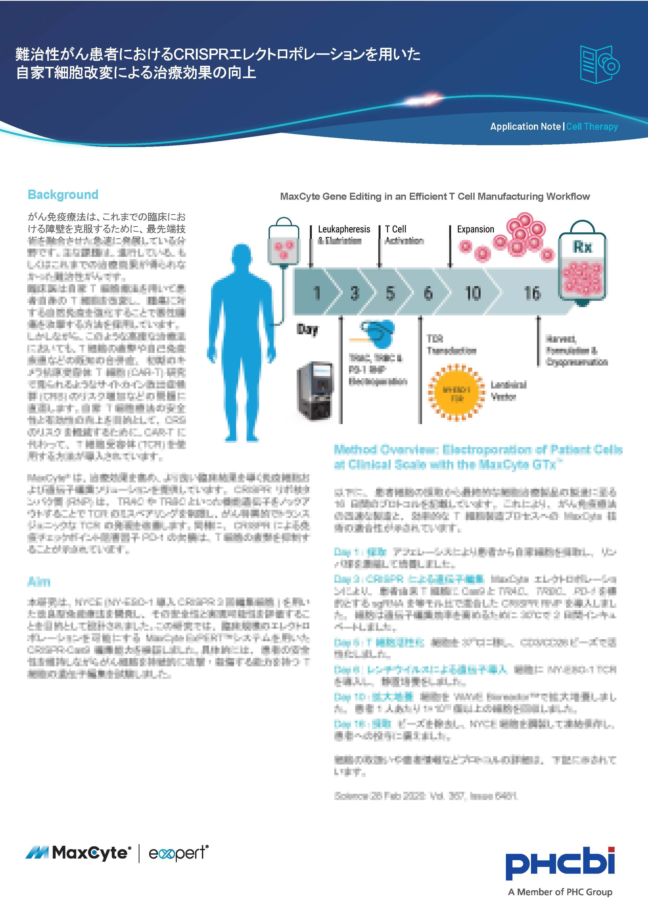 本資料では、CRISPRエレクトロポレーションを用いて、難治性がん患者の自家T細胞の作製及び機能評価を行いました。MaxCyte®技術でTRAC、TRBC、PD-1をノックアウトしたNYCE細胞を製造し、腫瘍攻撃能力と安全性を確認されました。また、編集効率は高く、副作用リスクを抑制しながら、腫瘍縮小が確認されました。この成果は、がん免疫療法の新たな可能性を示します。