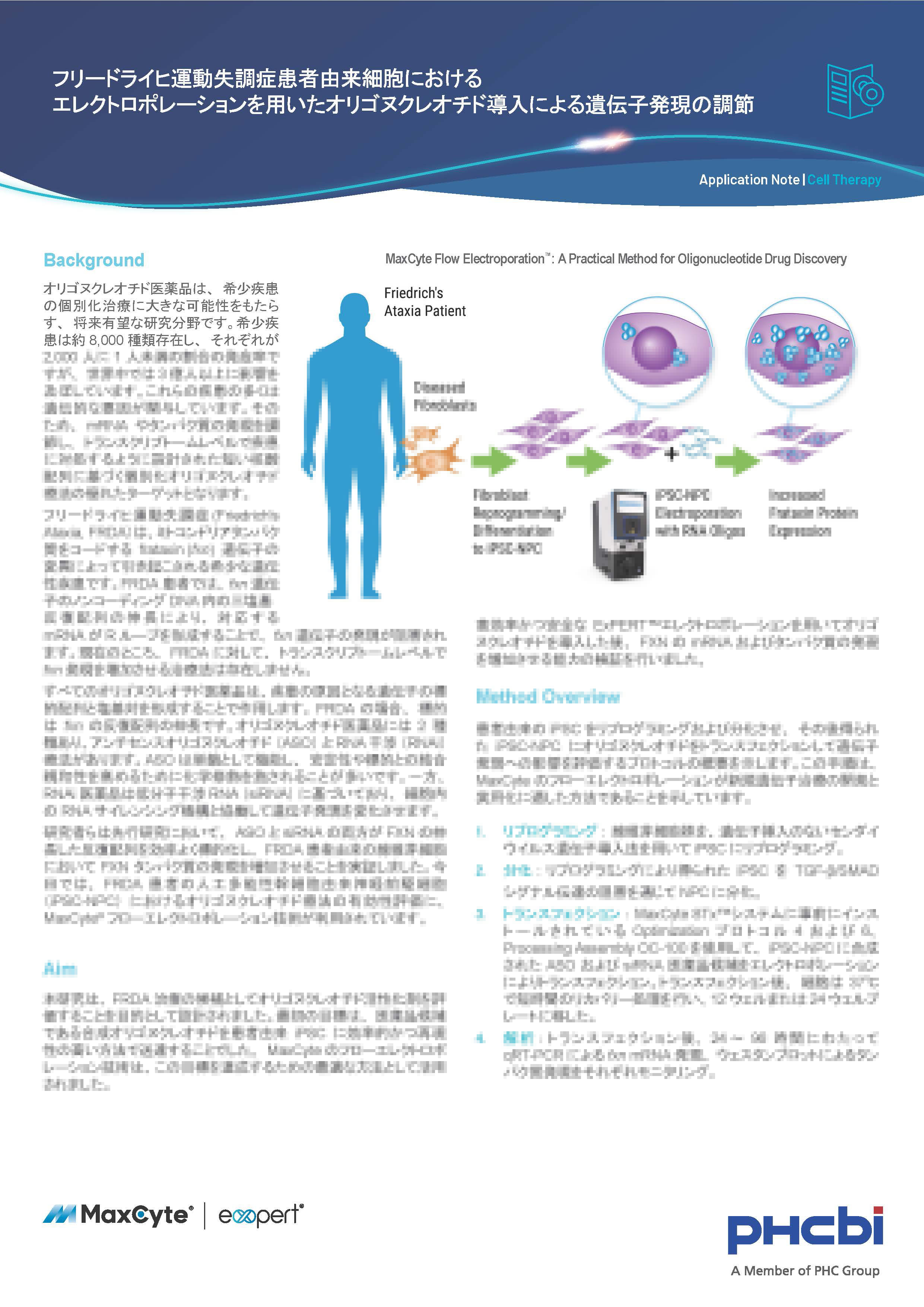 本資料では、フリードライヒ運動失調症患者由来のiPSCs由来神経前駆細胞に対し、MaxCyte®エレクトロポレーションによりオリゴヌクレオチドを導入しました。オリゴヌクレオチドの導入よりfxn遺伝子の発現を増加させることによる治療法を評価しました。導入したオリゴヌクレオチドにより、fxn mRNAおよびFrataxinタンパク質発現が正常レベル、そして持続的な効果が確認されました。この成果は、ExPERTシステムによるエレクトロポレーションがトランスクリプトームレベルでの遺伝性疾患への治療法開発に新たな可能性を示します。