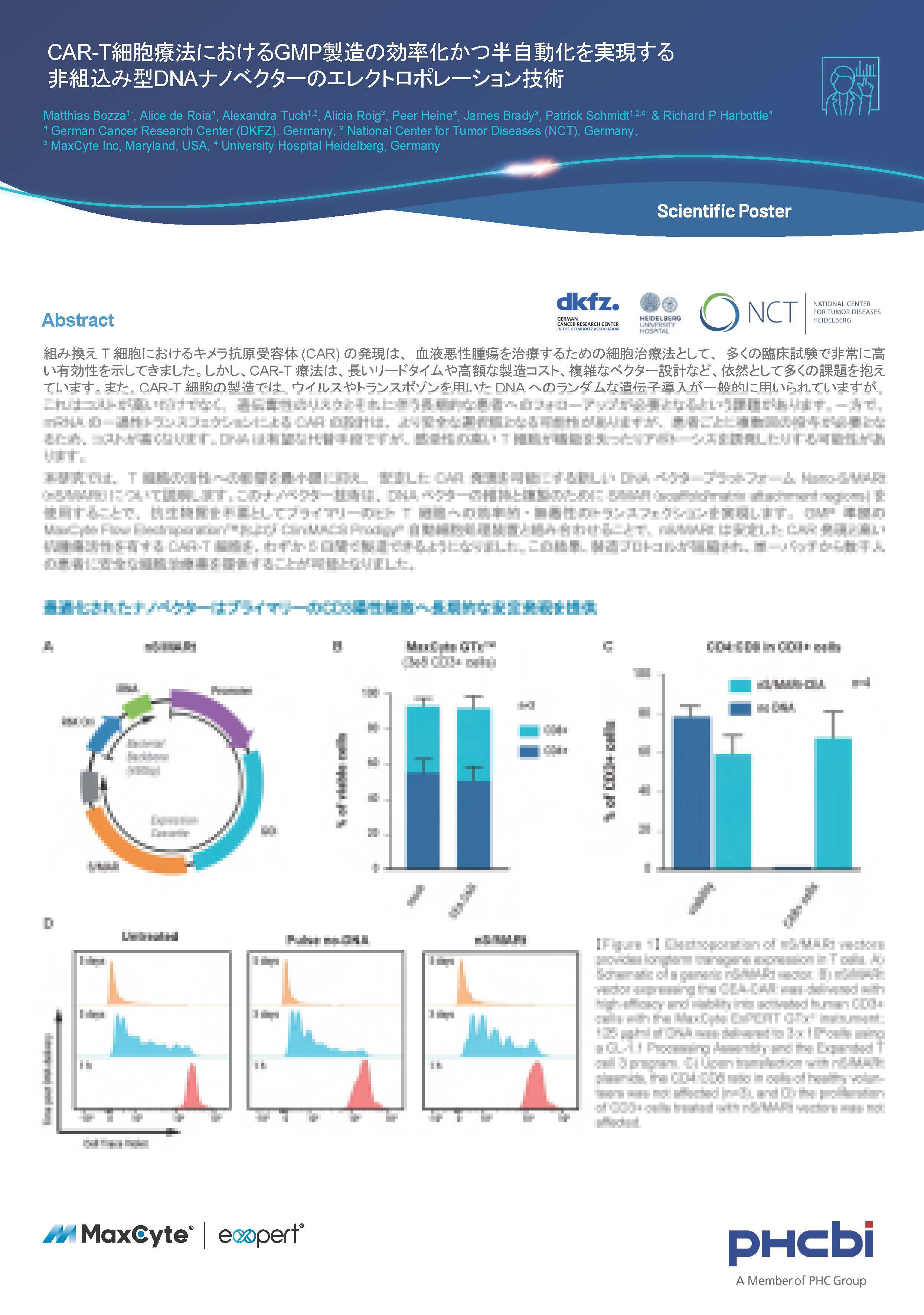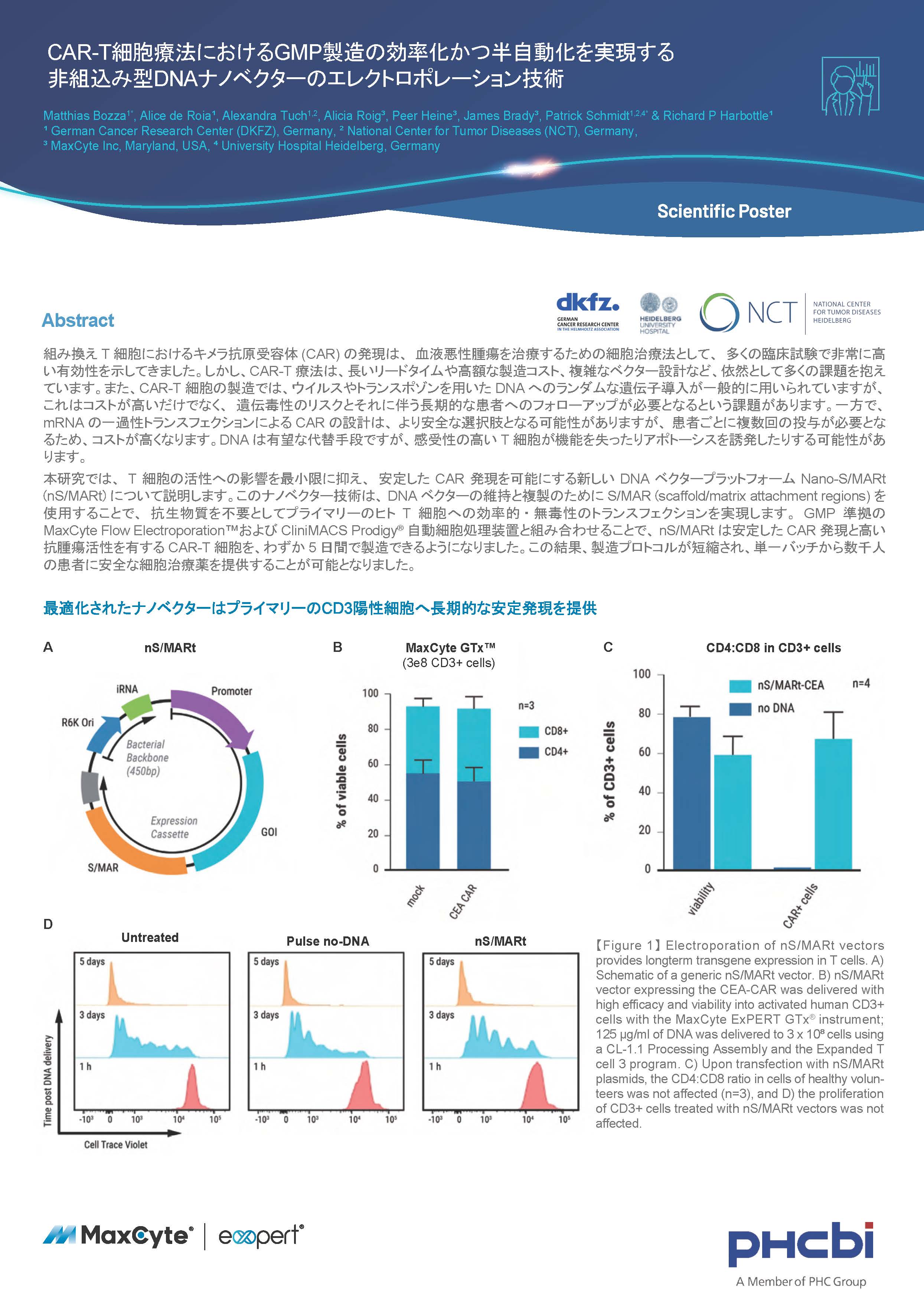 非組込み型DNAナノベクター「nS/MARt」をMaxCyte®エレクトロポレーションによりT細胞に導入しました。nS/MARtベクターは、抗生物質を必要とせず、T細胞の増殖能やCD4:CD8比に影響を与えることなく、高効率かつ無毒性で遺伝子導入を実現します。また、大規模な製造プロセスに対応し、50~75%の生存率と65~80%の遺伝子導入効率を達成しました。この技術は、CAR-T細胞療法の安全性、コスト効率、製造時間の短縮を大幅に向上させることが期待されます。この技術はGMP準拠のMaxCyte ExPERT GTx™を採用することで、CAR-T細胞の製造プロセスを効率化する方法を示します。